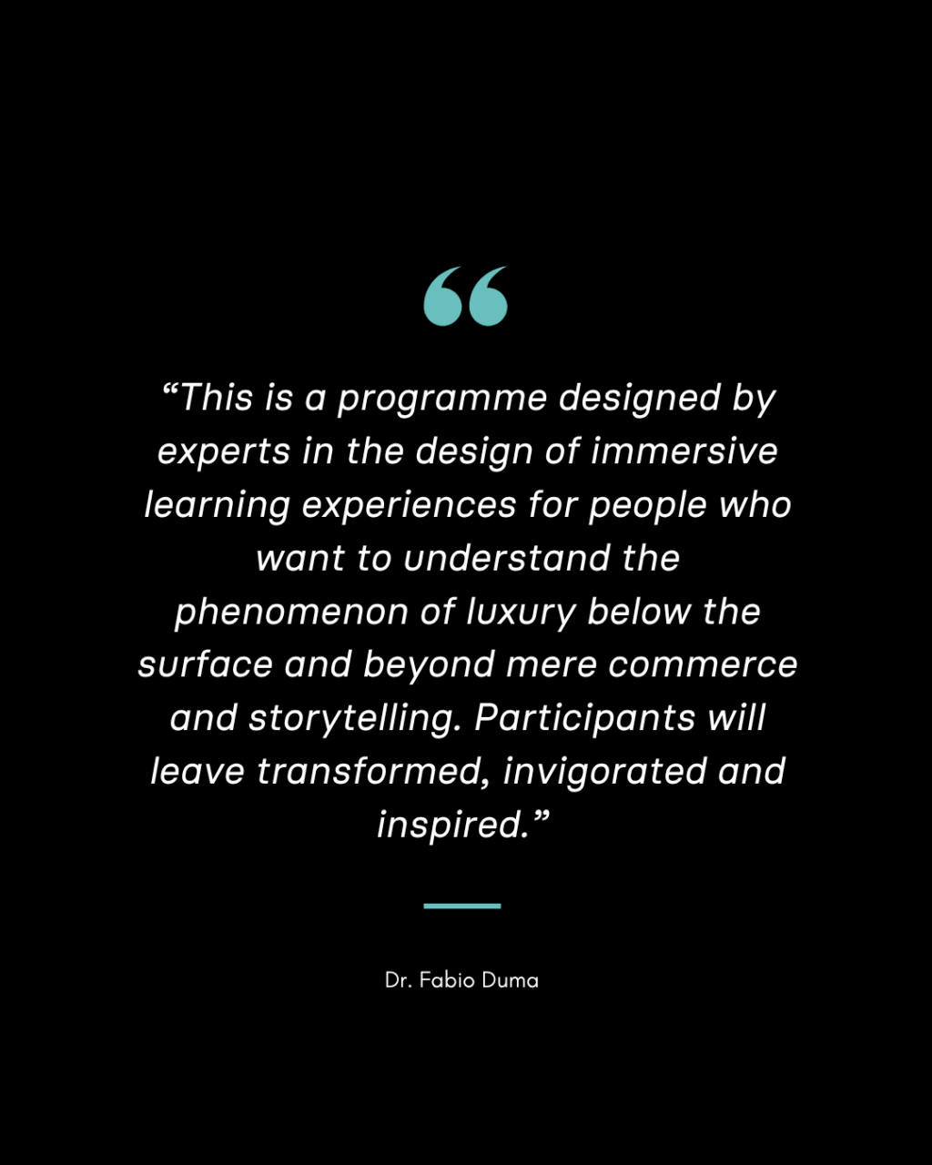 Participants preparing for their next career move or planning to launch their own business have the opportunity to book a 1:1 coaching package with Dr. Fabio Duma (www.fabioduma.com). Fabio is an internationally accredited (ICF, SCA, MRG) executive coach (IMD, HMS) and a trusted sparring partner to private clients, established & aspiring leaders and creative entrepreneurs in the luxury, cultural & creative industries and beyond.